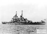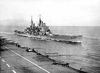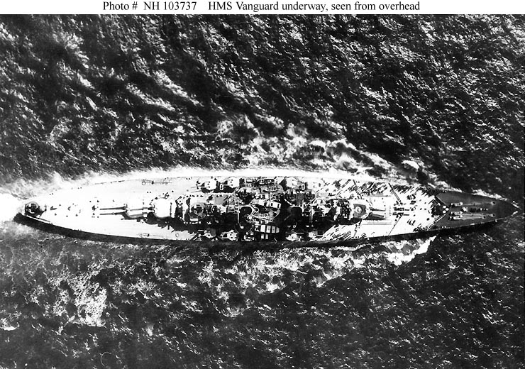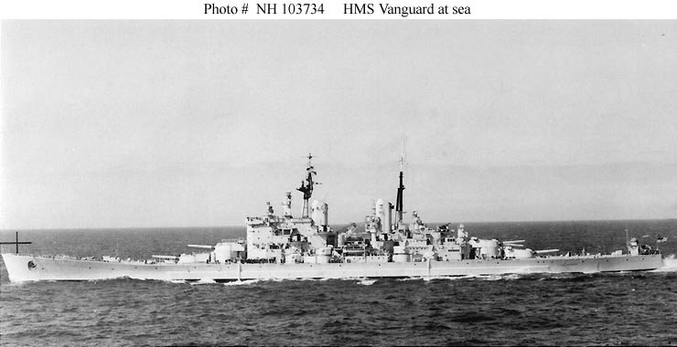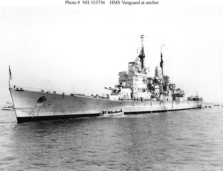 HMS Vanguard, a 44,500-ton (standard displacement) battleship, was built at Clydebank, Scotland. The last of the enormous number of British ships of the line, she was laid down in October 1941 with the intention of having a fast battleship in time for World War II employment. To this end, she was armed with old fifteen-inch guns on a hull of thoroughly modern design. Vanguard was completed in April 1946, eight months after the war had ended. In February-May 1947 she carried King George VI to South Africa and would have made another Royal Tour, this time to Australia, had the King's ill health not forced cancellation of the trip. During the first half of 1949 Vanguard served with the Mediterranean Fleet. Thereafter she was employed in the North Atlantic area, alternating as a training ship and as flagship of the Home Fleet. Kept in reserve after the mid-1950s, she was considered for conversion to a guided missile ship, but the great costs and technical uncertainties involved caused rejection of the idea. HMS Vanguard was scrapped beginning in August 1960.