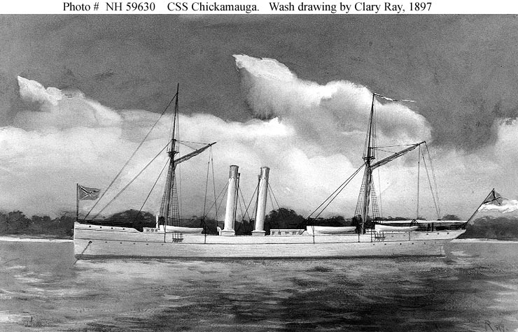 CSS Chickamauga, a 585-ton cruiser, was formerly the blockade running screw steamer Edith, which had been constructed in London, England, in 1863. She was purchased by the Confederate Navy at Wilmington, North Carolina, in 1864 and refitted as a warship. Chickamauga operated as a raider in the western North Atlantic in October and November 1864. After capturing several Union merchant ships, she returned to Wilmington. Chickamauga remained on the Cape Fear River until 25 February 1865, when she was burned to prevent capture.