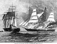 Photo #: NH 54156 "A Prize Disposed and One Proposed" 19th Century cyanotype photographic print of an oil painting by R.S. Floyd, depicting CSS Florida chasing a merchant sailing ship, after having set another prize afire (in the right distance). This may depict the events of 10 July 1864, when Florida took four prizes off the Eastern Shore of Maryland: the bark General Berry, which was captured first and burned; the bark (not a ship as shown here) Zelinda, captured second and burned later in the day; the schooner Howard, which was bonded and released with prisoners from previous captures; and the steamer Electric Spark, which was scuttled during the following night. U.S. Naval Historical Center Photograph. Online Image: 102KB; 740 x 635 pixels |