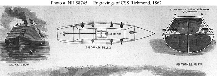 CSS Richmond, first of a class of six ironclad rams, was built at the Norfolk Navy Yard. Launched in early May 1862, as the Confederates prepared to evacuate the Norfolk area, she was towed up the James River to Richmond, Virginia, and completed there in July. She thereafter served in the James River Squadron, protecting the Confederacy's capital city from waterborne assault.