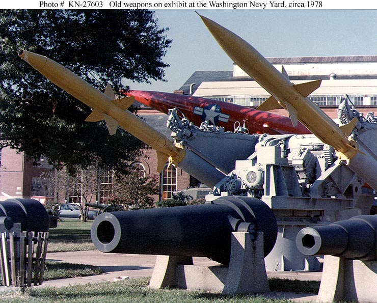 Photo #: KN-27603 (Color) Washington Navy Yard, Washington, D.C. Old weapons on exhibit in East Willard Park, circa Summer 1978. This area was rebuilt to another design in 1981-82, with the artifacts rearranged. Many of them, including all the missiles, were removed in or before the year 2000. The gun in the center is a 10-inch Brooke smoothbore from CSS Columbia. A Confederate 5-inch Whitworth rifle is at right, and a double-banded 7-inch Brooke rifle (captured on CSS Tennessee) is at left. A prototype launcher for "Terrier" missiles is behind these guns. In the center background is a "Regulus II" missile. Buildings 111 and 106 are in the distance. This photograph was received by the Naval Photographic Center in January 1979. Official U.S. Navy Photograph. Online Image: 143KB; 740 x 595 pixels Reproductions of this image may also be available through the National Archives photographic reproduction system as Photo # 428-KN-27603 |