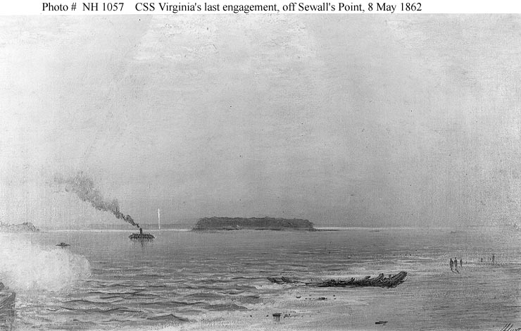 Just short of a month later, on 8 May, Monitor and other Federal ships shelled Confederate batteries at Sewell's Point to test their strength, and, hopefully, provoke Virginia to come out far enough to be ambushed. This time, the Confederates chose the path of caution.