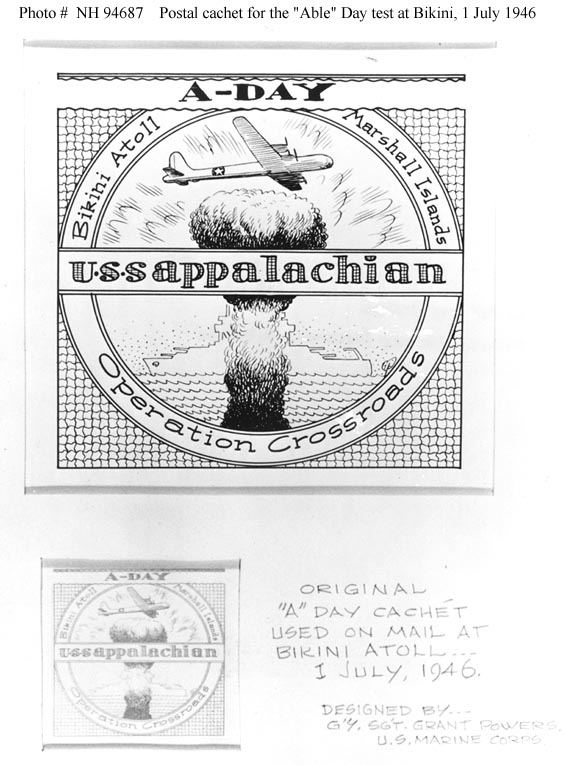 Photo #: NH 94687 Operation "Crossroads", July 1946 Postal cachet commemorating the "Able" Day atomic bomb test at Bikini Atoll, 1 July 1946. The cachet, designed by Gunnery Sergeant Grant Powers, USMC, was used on mail sent from USS Appalachian (AGC-1) on that day. U.S. Naval Historical Center Photograph. Online Image: 89KB; 565 x 765 pixels |