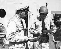Photo #: 80-G-87337 Lieutenant General Mark W. Clark, U.S. Army (left), Commanding General, Fifth Army, confers with Vice Admiral Henry Kent Hewitt, USN Commander, Western Naval Task Force (TF 80) On board USS Ancon (AGC-4) during the landings at Salerno, Italy, 12 September 1943. Note details of the life belt worn by Clark. Official U.S. Navy Photograph, now in the collections of the National Archives. Online Image: 103KB; 740 x 610 pixels Reproductions of this image may also be available through the National Archives photographic reproduction system. |