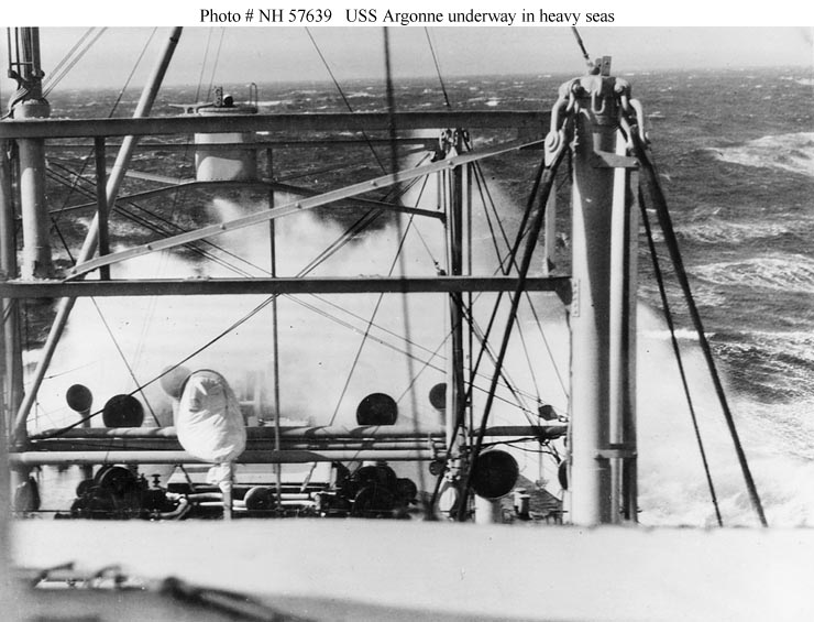 Photo #: NH 57639 USS Argonne (AS-10) View from above the bridge looking forward as the ship headed into heavy seas, during the 1920s or 1930s. The crowsnest, suspended between the forward kingposts, appears to be manned. U.S. Naval Historical Center Photograph. Online Image: 85KB; 740 x 565 pixels |