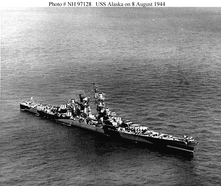 Photo #: NH 97128 USS Alaska (CB-1) Photographed from the air on 8 August 1944. Official U.S. Navy Photograph, from the collections of the Naval Historical Center. Online Image: 147KB; 740 x 625 pixels |