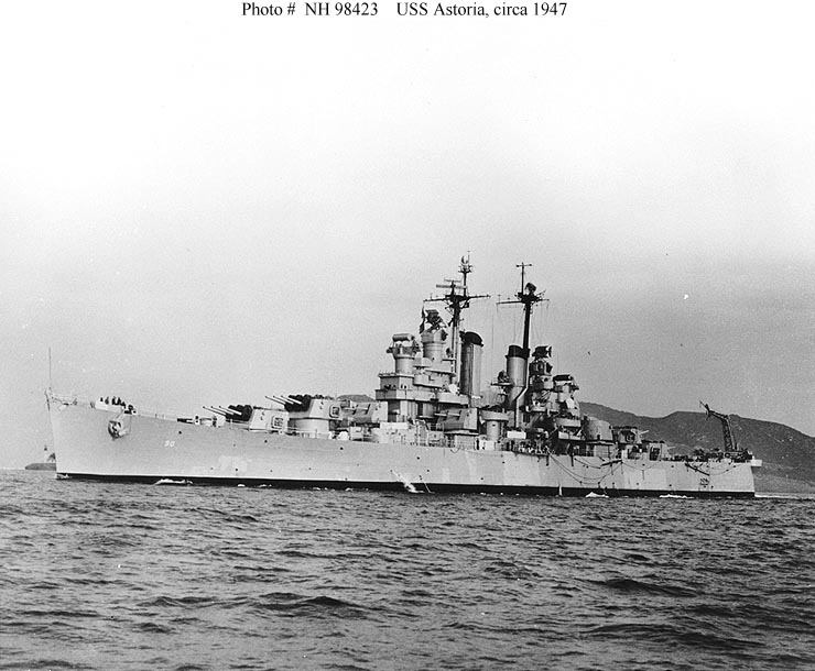 USS Astoria, a 10,000-ton Cleveland class light cruiser, was built at Philadelphia, Pennsylvania. Commissioned in mid-May 1944, she made a shakedown cruise in the Western Atlantic and, late in September, transited the Panama Canal en route to join the war against Japan. The new cruiser's first combat operation took place in December 1944, when she screened Task Force 38 aircraft carriers during the Mindoro invasion. Astoria continued her carrier escort duties for the next five months, as the fleet raided targets on the Asian mainland, Formosa and in Japan and supported amphibious campaigns against Luzon, Iwo Jima and Okinawa. During March-May 1945 she helped fight off intense enemy air attacks, claiming to have shot down eleven hostile aircraft. Following repairs in the Philippines during June, Astoria rejoined the carriers during their Japan raids of July and August. She also took part in surface anti-shipping sweeps off the enemy coast.