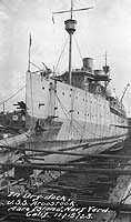 USS Aroostook (CM-3) alongside a pier at Naval Air Station San Diego, California, 12 October 1922. Port bow high aerial view. USS Aroostook (CM-3) off Oahu, Hawaii Territory, 27 April 1925. Taken from an aircraft based on USS Wright (AV-1). Starboard quarter low aerial view. The ship's extreme stern has been cropped out of the left side of this image. USS Aroostook (CM-3) on 28 February 1926, possibly off Honolulu, Hawaii. Port quarter aerial view, rather toward the broadside. The ship is seen distantly, only taking up about one-sixth of the width of the image. USS Aroostook (CM-3) at anchor in San Diego Harbor, California, on 4 August 1928. Starboard broadside aerial view, slightly toward the bow. As 80-G-466198, but port bow high aerial view.