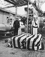 Photo #: NH 69018 USS Aaron Ward (Destroyer # 132) An officer and two sailors stand watch over the flag-draped caskets of Army Lieutenants Cecil H. Connolly and Waterhouse Weiser, on board the destroyer in November 1919. The two Army fliers were killed when their plane crashed while searching for other lost aviators in Mexico. Courtesy of the San Francisco Maritime Museum, San Francisco, California, 1969. U.S. Naval Historical Center Photograph. Online Image: 85KB; 590 x 765 pixels |