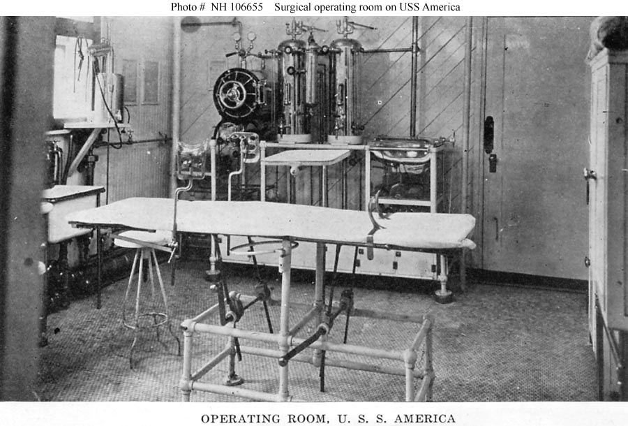 Halftone reproduction of a photograph of the ship's surgical operating room, circa 1919.