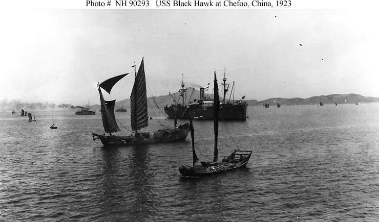 Photo #: NH 90293 USS Black Hawk (AD-9) At Chefoo, China, in the summer of 1923. Note the laden junks in the foreground and U.S. Navy destroyers in the distance. Courtesy of Captain A.L. Prosser, USN (Retired). U.S. Naval Historical Center Photograph. Online Image: 60KB; 740 x 435 pixels |
