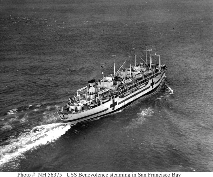 Photo #: NH 56375 USS Benevolence (AH-13) Underway in San Francisco Bay, California, in 1945-47 or in mid-1950. Courtesy of Donald M. McPherson, 1967. U.S. Naval Historical Center Photograph. Online Image: 105KB; 740 x 615 pixels |