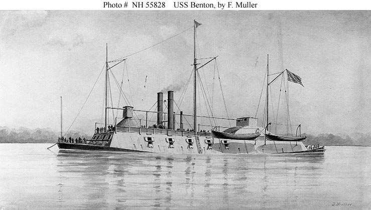 USS Benton, a 1033-ton ironclad river gunboat, was converted from a catamaran snagboat at Saint Louis, Missouri, for the Army's Western Gunboat Flotilla. Commissioned in February 1862, she took an active part in the Federal operations to open the Mississippi River and its tributaries. In the Spring of 1862, she was present at the captures of Island Number Ten, Fort Pillow and Memphis. During the Summer, Benton was in action with the Confederate ironclad Arkansas near Vicksburg, Mississippi, and participated in an expedition up the Yazoo River. She was transferred to the Navy in October 1862, and continued her service as the Mississippi Squadron's flagship into 1863.