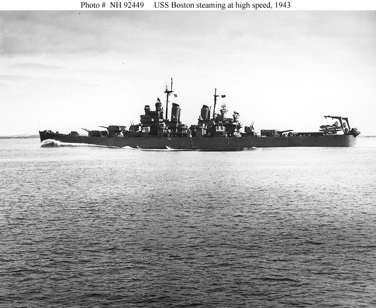 USS Boston, a 13,600 ton Baltimore class heavy cruiser built at Quincy, Massachusetts, was commissioned at the end of June 1943. Following several months of shakedown and training, the new ship transited the Panama Canal to the Pacific. She arrived at Pearl Harbor, Hawaii, late in the year and in January and February 1944 took part in the campaign to seize some of the Marshall Islands. Primarily assigned to escort aircraft carriers, as she generally was throughout the rest of the conflict, Boston also used her eight-inch guns in the Eniwetok pre-invasion bombardment. During the next several months, the cruiser participated in raids throughout the Central Pacific and supported landings in Northwestern New Guinea.