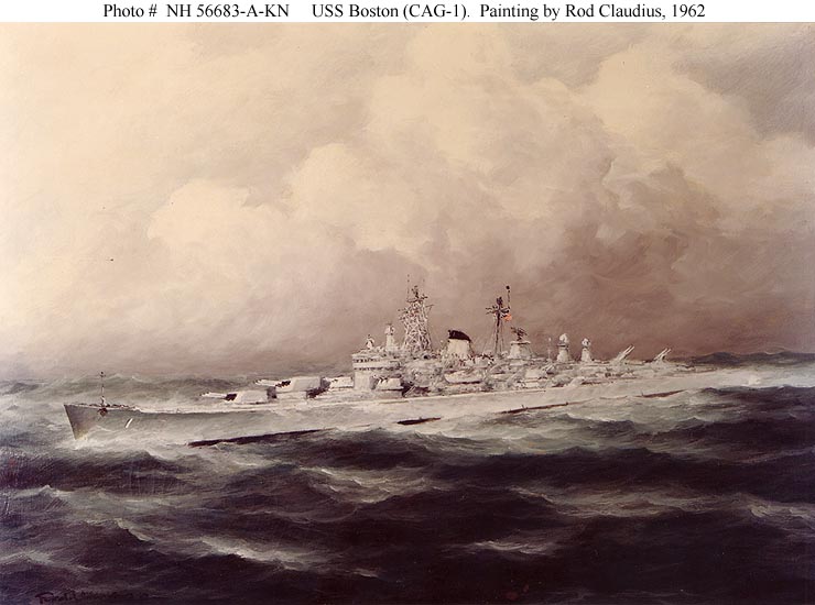 Photo #: NH 56683-A-KN (color) USS Boston (CAG-1) Painting by Rod Claudius, Rome, Italy, 1962. This painting was one of a series of depictions of U.S. Navy ships named Boston that Claudius made for display on board USS Boston (CAG-1). U.S. Naval Historical Center Photograph. Online Image: 64KB; 740 x 550 pixels |