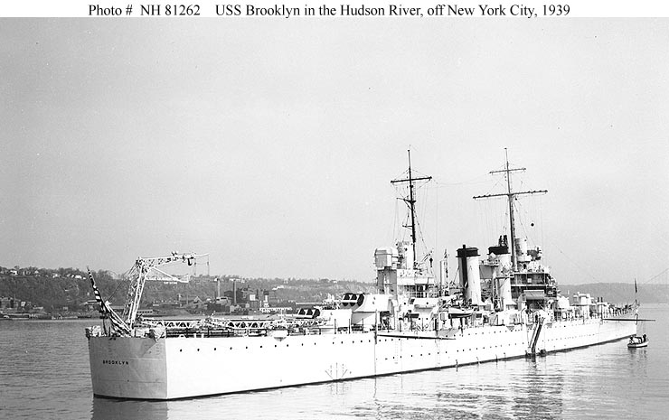 Photo #: NH 81189 USS Brooklyn (CL-40) Anchored in the Hudson River, off New York City, 1939. Donation of Lieutenant Gustave J. Freret, USN (Retired), 1972. U.S. Naval Historical Center Photograph. Online Image: 63KB; 740 x 465 pixels |