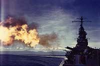 Photo #: 80-G-K-2850 (Color) USS Biloxi (CL-80) Firing her 6"/47 main battery guns while steaming in a turn, during her shakedown cruise, October 1943. Official U.S. Navy Photograph, now in the collections of the National Archives. Online Image: 70KB; 740 x 515 pixels Reproductions of this image may also be available through the National Archives photographic reproduction system. |