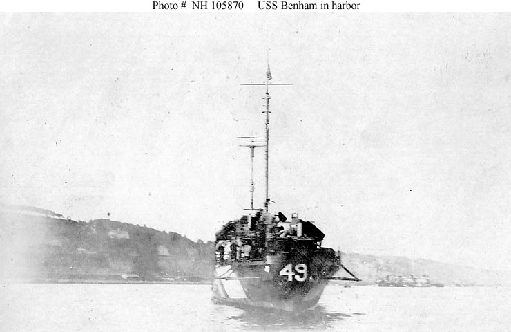 USS Benham, a 1036-ton Aylwin class destroyer, was built at Philadelphia, Pennsylvania. She was commissioned in January 1914 and operated in the western Atlantic until May 1917, the month after the United States entered World War I, when she steamed across the Atlantic to begin anti-submarine patrol and convoy escort service in European waters. Based at Queenstown, Ireland, and after June 1918 at Brest, France, Benham had a number of encounters with German U-boats, but none resulted in confirmed damage to the enemy or in harm to the destroyer. She was, however, seriously damaged in a collision with a British warship.