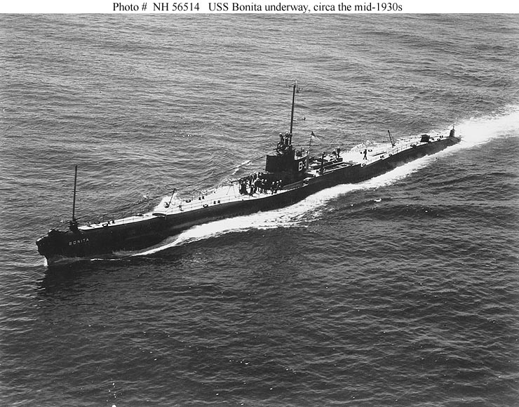 USS V-3, a 2000-ton V-1 class fleet submarine, was built at the Portsmouth Navy Yard, Kittery, Maine. Commissioned in May 1926, she operated along the U.S. Atlantic coast and in the Caribbean area until going to the Pacific in December 1927. Renamed Bonita in March 1931 and redesignated SS-165 in July of that year, she was active off the West Coast until June 1932, when she entered the Rotating Reserve. The submarine resumed operations in September 1933 and, during the next three years, visited Hawaii and Alaska, as well as taking part in exercises in the Caribbean and in the eastern Pacific. Bonita, whose design had proven to be not very satisfactory, was sent back to the Atlantic in January 1937 to be laid up. She decommissioned at the Philadelphia Navy Yard in June 1937.