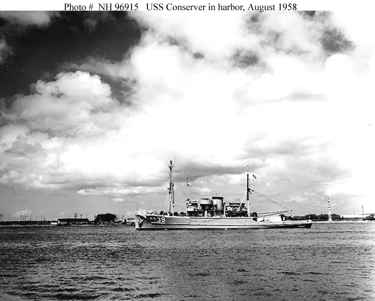 USS Conserver, a 1441-ton Diver class salvage ship built at Napa, California, was commissioned in June 1945. She arrived in Japanese waters in September 1945 and operated there in support of occupation activities until March 1946. She then went to the Central Pacific, where she was involved in the Operation "Crossroads" atomic weapons tests well into 1947. During the remainder of her long career, Conserver alternated service areas between the U.S. Pacific coast area, the Central Pacific and the Far East. In 1950-53, she was intermittently employed in Korean war operations. The salvage ship was also present during the 1958 Quemoy crisis.