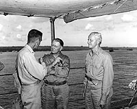 Photo #: 80-G-34803 Secretary of the Navy Frank Knox (center) Chats with Lieutenant Colonel Evans F. Carlson, USMC, and Admiral Chester W. Nimitz (at right), on board USS Curtiss (AV-4) at "Button" Naval Base, Espiritu Santo, New Hebrides, 20 January 1943. Secretary Knox was then touring the Guadalcanal campaign area. Official U.S. Navy Photograph, now in the collections of the National Archives. Online Image: 108KB; 740 x 615 pixels Reproductions of this image may also be available through the National Archives photographic reproduction system. |