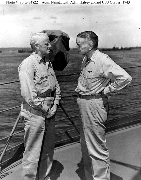Photo #: 80-G-34822 Admiral Chester W. Nimitz, USN, Commander in Chief Pacific and Pacific Ocean Areas (left), and Admiral William F. Halsey, USN, Commander, South Pacific Area and South Pacific Force Confer on board USS Curtiss (AV-4) at "Button" Naval Base, Espiritu Santo, New Hebrides, 20 January 1943. Official U.S. Navy Photograph, now in the collections of the National Archives. Online Image: 84KB; 600 x 765 pixels Reproductions of this image may also be available through the National Archives photographic reproduction system. |