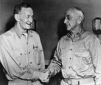 Photo #: 80-G-43065 Rear Admiral John S. McCain (left) shakes hands with Rear Admiral Aubrey W. Fitch On the occasion of McCain's relief by Fitch as Commander, Aircraft, South Pacific Force, circa 21 September 1942. RAdm. McCain was transferred to Washington, D.C., to become Chief of the Bureau of Aeronautics. The photo may have been taken on board USS Curtiss (AV-4) at Espiritu Santo, New Hebrides. Official U.S. Navy Photograph, now in the collections of the National Archives. Online Image: 121KB; 740 x 645 pixels Reproductions of this image may also be available through the National Archives photographic reproduction system. |