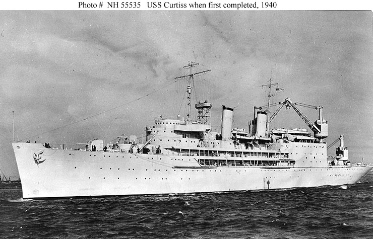 USS Curtiss, lead ship of a class of two 8671-ton seaplane tenders, was built at Camden, New Jersey. Commissioned in November 1940, she served in the Atlantic until May 1941, when she was sent to the Pacific. During the next several months, she supported seaplane operations out of Pearl Harbor, Hawaii, and made one voyage to reinforce the garrison at Wake Island. Curtiss was at Pearl Harbor on 7 December 1941, during the Japanese Attack, in which she was damaged by a bomb hit and a Japanese plane that crashed into her superstructure. Following repairs on the west coast, she returned to Pearl Harbor in February 1942 and remained there until mid-year.