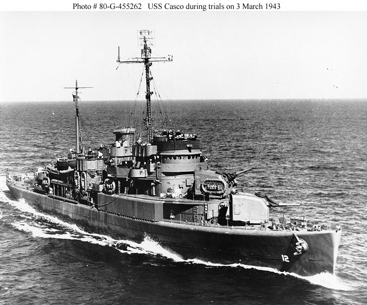 Photo #: 80-G-455262 USS Casco (AVP-12) Running trials off Vashon Island in Puget Sound, Washington, on 3 March 1943 upon completion of battle damage repairs. Official U.S. Navy Photograph, now in the collections of the National Archives. Online Image: 109KB; 740 x 615 pixels Reproductions of this image may also be available through the National Archives photographic reproduction system. |
