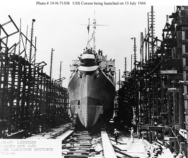 Photo #: 19-N-71508 USS Corson (AVP-37) Being launched at the Lake Washington Shipyards, Houghton, Washington, on 15 July 1944. Photograph from the Bureau of Ships Collection in the U.S. National Archives. Online Image: 120KB; 740 x 625 pixels Reproductions of this image may also be available through the National Archives photographic reproduction system. |