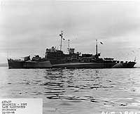 USS Corson, a 1,766-ton Barnegat class small seaplane tender, was built at Houghton, Washington, and was commissioned in December 1944. She sailed from San Diego in February 1945 and, after briefly tending seaplanes at Pearl Harbor and Eniwetok, arrived at Ulithi in April. In May she made two trips from Ulithi to the Palaus and participated in a one-day bombardment of Eil Malk island. Departing Ulithi in late June, she served at Eniwetok in July and early August and at Okinawa in August and September. Corson moved to Nagasaki, Japan, in mid-September and tended seaplanes there, at Sasebo, and in Hiro Wan in support of occupation forces. She departed Japan in January 1946 and arrived at Alameda, California, in February for inactivation. Corson was decommissioned in June 1946.