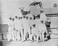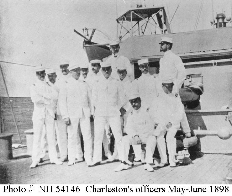 Photo #: NH 54146 USS Charleston (C-2) Halftone photograph of a group of the ship's officers, taken in May-June 1898 while in passage from Honolulu to Guam. Those present include: Seated at right, left to right: Lieutenant (Junior Grade) George R. Slocum Assistant Engineer James B. Henry, jr. Standing, left to right: Ensign William A. Moffett Assistant Engineer Charles L. Leiper Paymaster James S. Phillips Surgeon Henry T. Percy Pay Clerk Phillips (or Middleton?) Assistant Engineer Albert W. Marshall Lieutenant Commander Gottfried Blocklinger Passed Assistant Engineer Josiah S. McKean Passed Assistant Surgeon Ammen Farenholt Ensign Waldo Evans Second Lieutenant John T. Myers, USMC U.S. Naval Historical Center Photograph. Online Image: 70,084 bytes; 740 x 625 pixels |