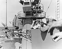 Photo #: NH 54117 Unknown Servicemen of World War II and the Korean War Crewmen of USS Boston (CAG-1) render honors as the first casket is transferred to USS Canberra (CAG-2), prior to ceremonies on board Canberra to select the Unknown Serviceman of World War II. Two more caskets are still on board Boston, visible just aft of the starboard whaleboat davits. The ceremonies took place off the Virginia Capes on 26 May 1958. Official U.S. Navy Photograph, from the collections of the Naval Historical Center. Online Image: 122KB; 740 x 615 pixels |