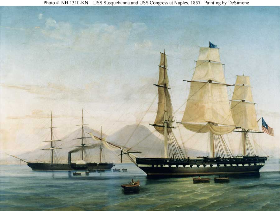 Oil painting by DeSimone, depicting the ships at Naples in 1857.