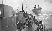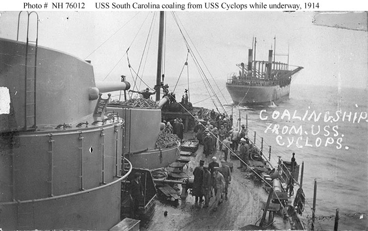 Photo #: NH 76012 USS South Carolina (BB-26) and USS Cyclops (1910-1918) Engaged in an experimental coaling while under way at sea in 1914. Rigging between the two ships was used to transfer two 800-pound bags of coal at a time. The bags were landed on a platform in front of the battleship's forward 12-inch gun turret, and then carried to the bunkers. The donor, who served as a seaman in South Carolina at the time, comments: "it showed that this was possible but a very slow method of refueling. Nothing was heard of the test afterwards." Donation of Earle F. Brookins, Jamestown, NY, 1972. U.S. Naval Historical Center Photograph. Online Image: 57,797 bytes; 740 x 475 pixels |