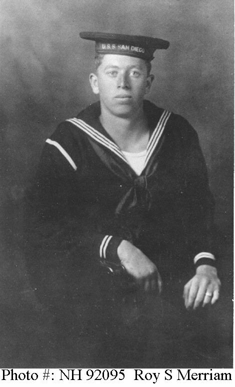 Photo #: NH 92095 Roy Stuart Merriam, Coxwain, U.S. Navy Who was lost with USS Cyclops in March 1918. His cap band is from USS San Diego (ACR-6). U.S. Naval Historical Center Photograph. Online Image: 46,023 bytes; 470 x 775 pixels |