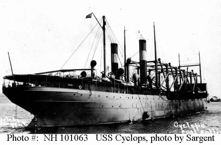 Photo #: NH 101063 USS Cyclops (1910-1918) Photographed by Sargent, circa 1913. Copied from the album of Francis Sargent, courtesy of Commander John Condon, 1986. U.S. Naval Historical Center Photograph. Online Image: 58,404 bytes; 740 x 485 pixels |