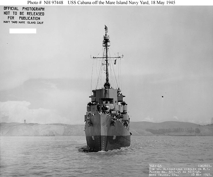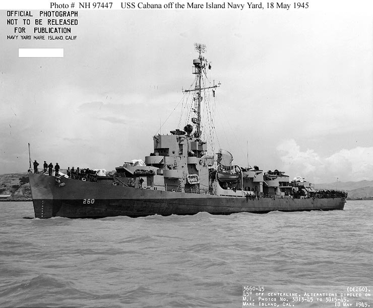 USS Cabana, a 1140-ton Evarts class escort ship built at the Boston Navy Yard, Massachusetts, was commissioned in July 1943. Following shakedown, she went to the Pacific in October. In the last part of 1943 and the first two months of 1944, Cabana escorted tankers and transports during the operations to capture the Gilbert and Marshall Islands. She was part of an anti-submarine hunter-killer group in March and April 1944 and participated in the conquest of the Marianas during June, July and August.