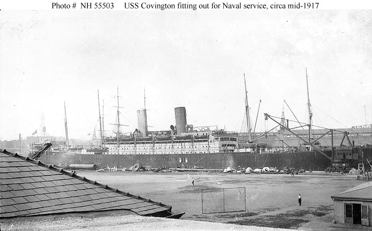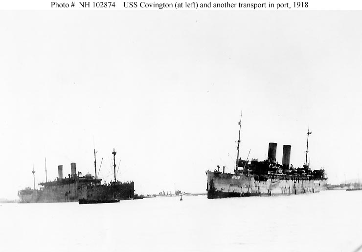 USS Covington, a 16,339 gross ton transport, was built at Danzig, Germany, in 1908 as the passenger liner Cincinnati. When World War I broke out in August 1914 the German-flag ship took refuge in U.S. waters, and was seized at Boston, Massachusetts, when the United States entered the conflict in April 1917. She was later turned over to the Navy, renamed Covington and placed in commission in late July. The ship underwent shipyard work for the next few months and began her active war work in mid-October 1917 when she left port for her first voyage carrying U.S. troops to France. Covington made five additional trips to France during the rest of 1917 and the first half of 1918, taking nearly 22,000 men to participate in operations on the "Great War"'s Western Front. In the evening of 1 July 1918, while en route back to the U.S. on the return leg of her sixth trooping voyage, USS Covington was torpedoed by the German submarine U-86. She floated through the night and was taken in tow by tugs sent out from Brest, but sank on the afternoon of 2 July.