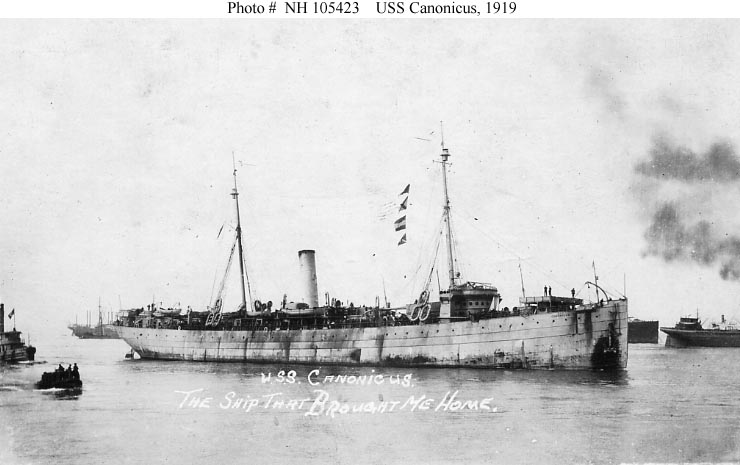 Canonicus returned to the U.S. at the beginning of 1919, less than two months after the end of World War I's fighting. Reconverted to a troop transport and transferred to the Cruiser and Transport Force, she made three voyages from France to the East Coast, bringing home more than four-thousand veterans of the "Great War". USS Canonicus was decommissioned in early August 1919 and turned over to the U.S. Shipping Board for return to her owner, the Southern Pacific Steamship Company.