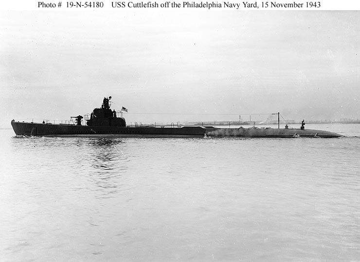 Photo #: 19-N-54180 USS Cuttlefish (SS-171) Off the Philadelphia Navy Yard, Pennsylvania, 15 November 1943. Photograph from the Bureau of Ships Collection in the U.S. National Archives. Online Image: 49KB; 740 x 540 pixels Reproductions of this image may also be available through the National Archives photographic reproduction system. |