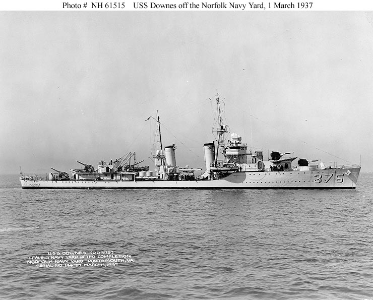 USS Downes, a 1,500-ton Mahan class destroyer, was built at the Norfolk Navy Yard, Virginia. She commissioned in January 1937 and was sent to the Pacific later in that year. Into 1940, when her base was shifted to Pearl Harbor, Downes operated out of San Diego, California. In March and April 1941, she crossed the Pacific to visit Australia.