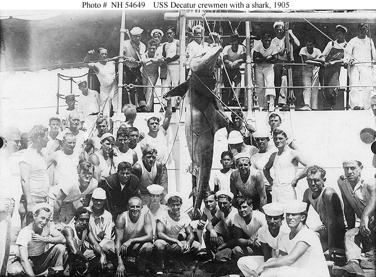 Photo #: NH 54649 USS Decatur (Destroyer # 5) Members of her crew display a shark they caught, in Asiatic waters, 1905. Courtesy of Admiral (Albert W.?) Grant. U.S. Naval Historical Center Photograph. Online Image: 141KB; 740 x 545 pixels |