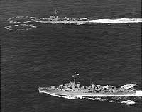 Photo #: 80-G-415520 USS Epperson (DDE-719), center USS Sarsfield (DD-837), at right Dropping depth charges during anti-submarine warfare exercises, 15 June 1950. Sarsfield has also fired her "K-Gun" depth charge projectors, making vertical smoke trails (aft of the ship) and impact splashes to port and starboard. Official U.S. Navy Photograph, now in the collections of the National Archives. Online Image: 92KB; 740 x 615 pixels Reproductions of this image may also be available through the National Archives photographic reproduction system. |