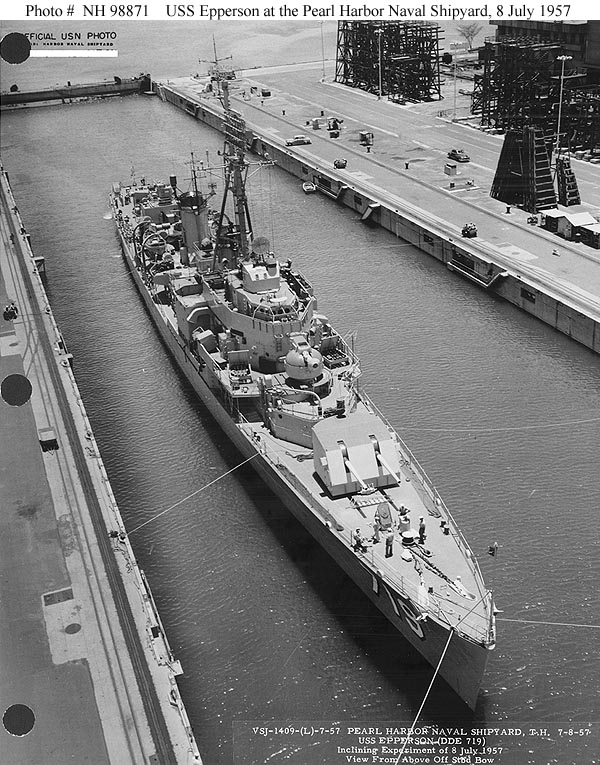 Photo #: NH 98871 USS Epperson (DDE-719) Undergoes an inclining experiment at the Pearl Harbor Naval Shipyard, Hawaii, 8 July 1957. Official U.S. Navy Photograph, from the collections of the Naval Historical Center. Online Image: 147KB; 600 x 765 pixels |