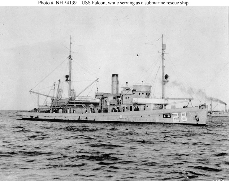 USS Falcon, a 950-ton Lapwing class minesweeper, was built at Morris Heights, New York. Commissioned in November 1918, she served along the U.S. east coast until mid-1919, when she deployed to Scotland to assist in clearing the North Sea Mine Barrage. Falcon returned to the United States in November 1919, but returned to European waters in March-August 1920. She was permanently assigned to submarine salvage duties in 1921, after completing salvage work on USS S-5 (SS-110) during that year. In 1925, Falcon briefly deployed to the Pacific, steaming as far west as Hawaii before returning to her usual Atlantic coast station.