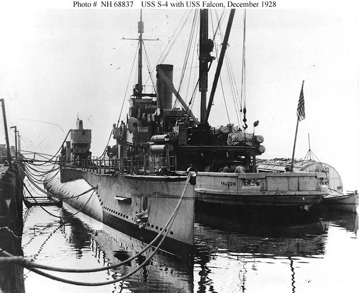 Photo #: NH 69221 USS S-4 (SS-109) Photograph dated 20 December 1928, during salvage tests off New London, Connecticut. She is being supported by salvage pontoons, with USS Falcon (AM-28) assisting from alongside and a U.S. Coast Guard patrol boat off her bow. Courtesy of the San Francisco Maritime Museum, San Francisco, California, 1969. U.S. Naval Historical Center Photograph. Online Image: 72KB; 740 x 580 pixels |