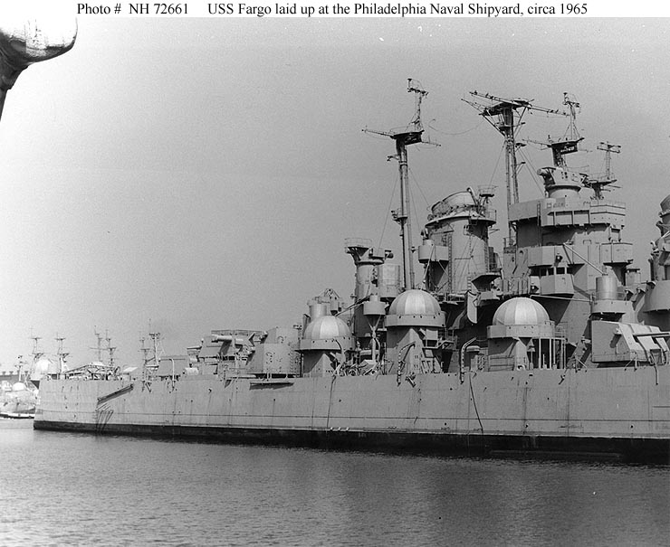 Photo #: NH 72661 USS Fargo (CL-106) Laid up in the Reserve Basin at the Philadelphia Naval Shipyard, Pennsylvania, in about 1965. U.S. Naval Historical Center Photograph. Online Image: 90KB; 740 x 605 pixels |