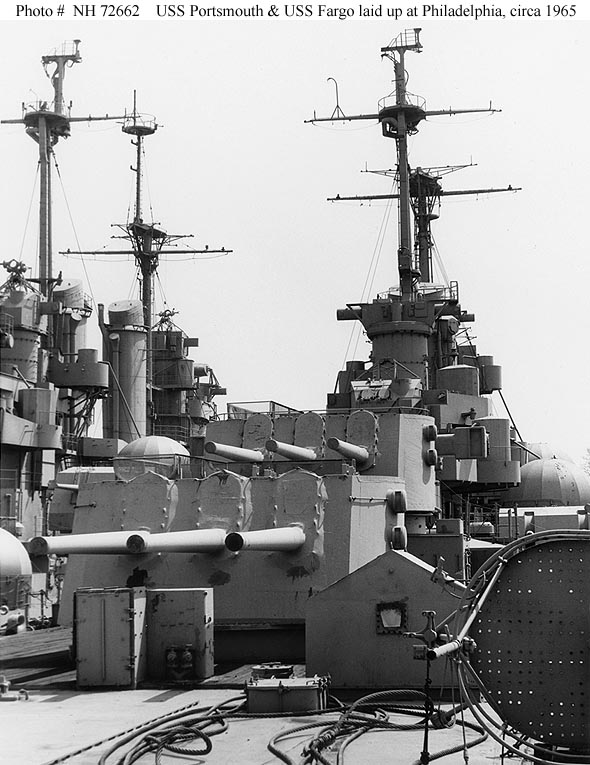 Photo #: NH 72660 USS Fargo (CL-106) Laid up in the Reserve Basin at the Philadelphia Naval Shipyard, Pennsylvania, in about 1965. USS Portsmouth (CL-102) is at right. U.S. Naval Historical Center Photograph. Online Image: 104KB; 740 x 610 pixels |