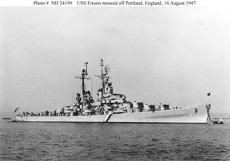 Photo #: NH 54199 USS Fresno (CL-121) Moored off Portland, England, 14 August 1947. Courtesy of Rear Admiral Elliott Strauss, USN, 1956. U.S. Naval Historical Center Photograph. Online Image: 81KB; 740 x 520 pixels |